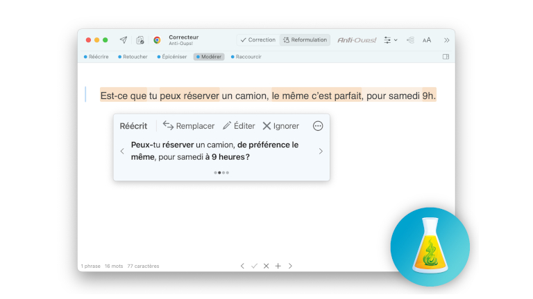 Antidote+ Personnel, c'est la protection linguistique ultime. Cet abonnement d’un an vous donne accès à un correcteur avancé, à de riches dictionnaires et à des guides linguistiques détaillés. Le meilleur? Il fonctionne sur tout ordinateur, téléphone, tablette ou Chromebook. Cette édition offre même des suggestions de reformulation ingénieuses pour améliorer vos écrits et les rendre fidèles à vos idées.