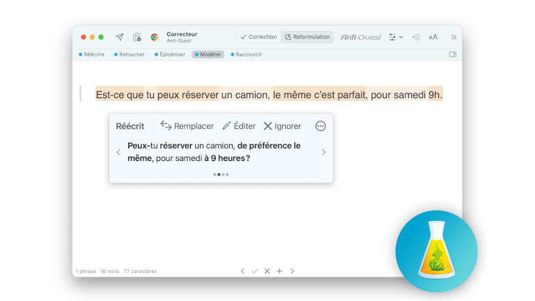Antidote+ Personnel offre un correcteur avancé, de riches dictionnaires et des guides linguistiques détaillés sur tout ordinateur, téléphone, tablette ou Chromebook. Cet abonnement d’un an pour un utilisateur donne accès à Antidote 12, Antidote Web et Antidote Mobile. Cette édition de la gamme d’applications propose notamment des suggestions de reformulation ingénieuses et fidèles à vos idées pour améliorer vos écrits.