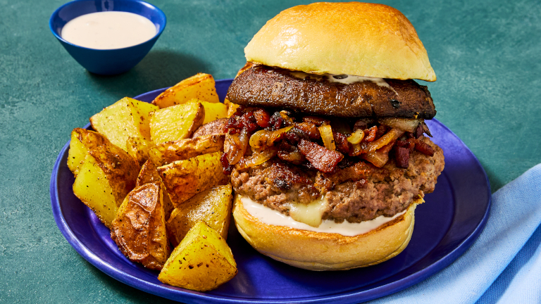 - Burger de bœuf farci au fromage en grains : un classique revisité avec une confiture de bacon maison, une mayonnaise à la truffe et des pommes de terre croustillantes.