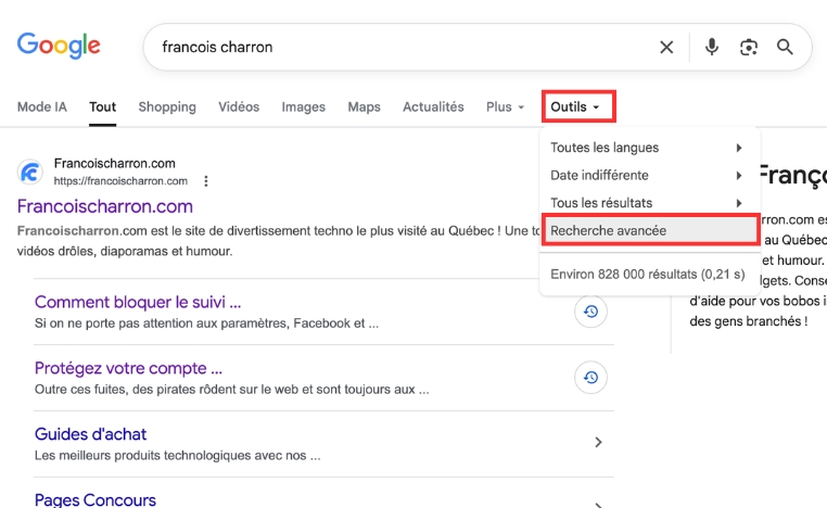 Ne vous fiez pas qu'aux premiers résultats. Sous la barre de recherche, le bouton Outils est là pour filtrer par date ou par correspondance exacte.