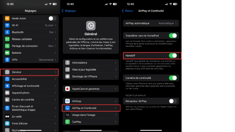 Il faut aussi s'assurer que l'option Handoff est activée en allant vérifier sur notre iPad dans l'application Réglages, puis dans Général et après dans AirPlay et Continuité.