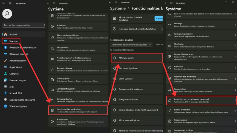 Pour connecter les deux ensemble, il faut s'assurer d'activer préalablement la fonction. Dans les paramètres de son ordinateur Windows, il faut aller dans Système, puis Fonctionnalité facultative pour vérifier si la fonction Affichage sans-fil est bien installée.