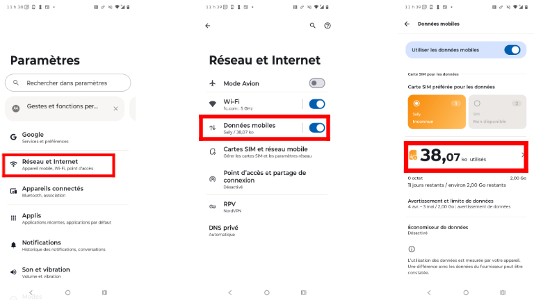 Important : sur plusieurs téléphones Android, la période de consommation de données se réinitialise automatiquement chaque mois.