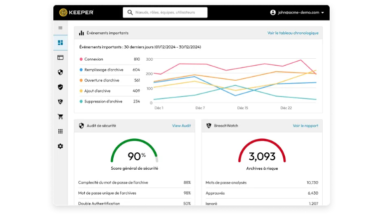 Offre la gestion des mots de passe d'entreprise, les dossiers d'équipe partagés, l'administration centralisée et, selon la formule, des fonctionnalités avancées comme KeeperPAM.