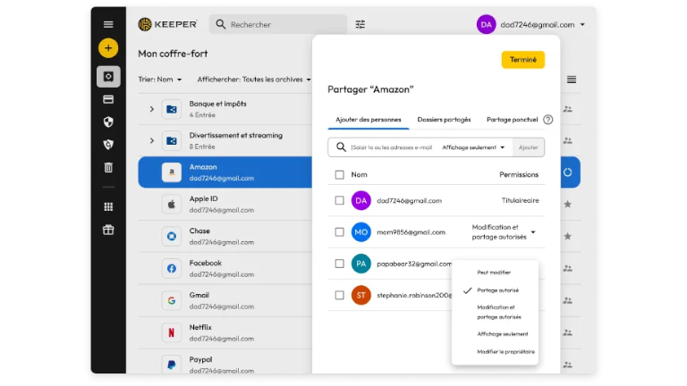 Keeper permet le partage sécurisé d'enregistrements (mots de passe, fichiers) avec d'autres utilisateurs Keeper, avec une gestion des permissions.
