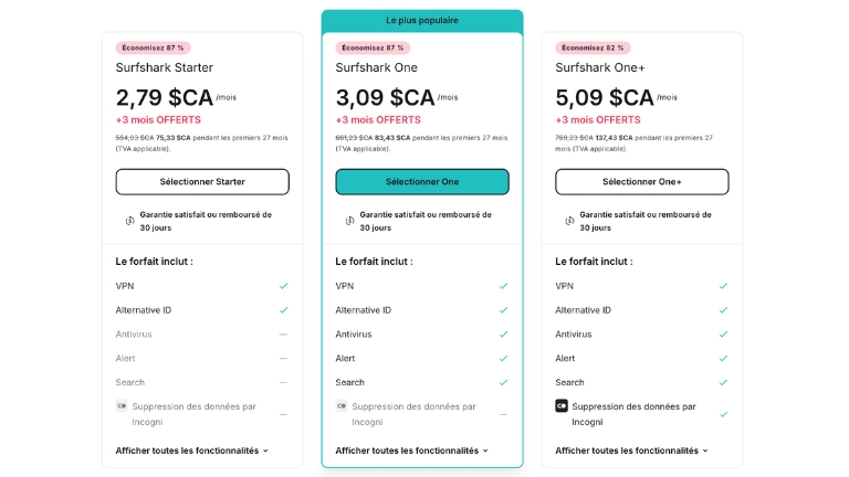 On a donc les 3 outils pour 2 ans à 82% de rabais, ce qui revient à 5,09$ par mois. Cette fois-ci, Surfshark nous donne 3 mois gratuits.