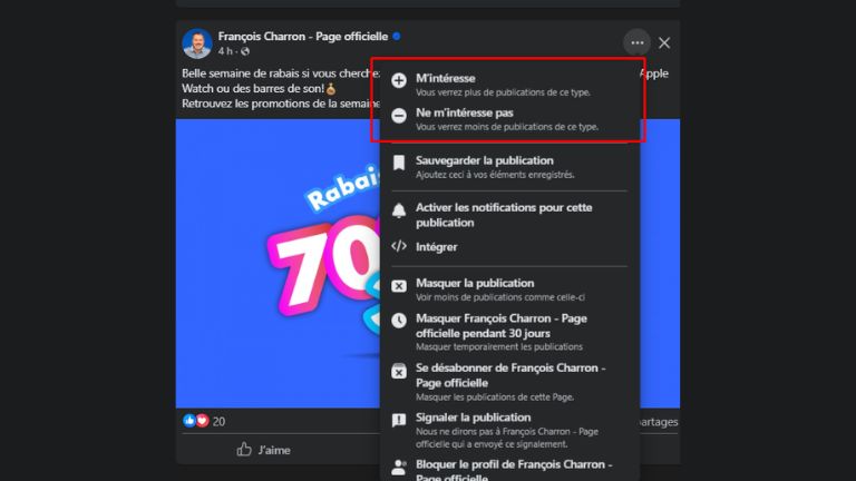 Lorsque l'on voit une publication que l'on n'aime pas (ou que l'on aime), on peut cliquer sur les trois petits points en haut à droite de celle-ci. En faisant ça, on peut cliquer sur la fonction "Ce contenu ne m'intéresse pas" et, normalement, nous nous ferons moins montrer du contenu de la sorte.