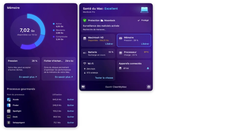 CleanMyMac optimise les performance et surveille notre système en temps réel pour détecter les applications qui utilisent trop de mémoire. On peut décider de fermer ces programmes gourmands directement dans le tableau de bord.
